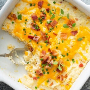 Creamy mashed cauliflower mixed with sour cream, cheddar cheese, bacon, and then baked. This gluten free, low carb, keto-friendly recipe won’t just be a substitute for mashed potatoes, it will actually be a go-to dinner side dish. It’s so good!