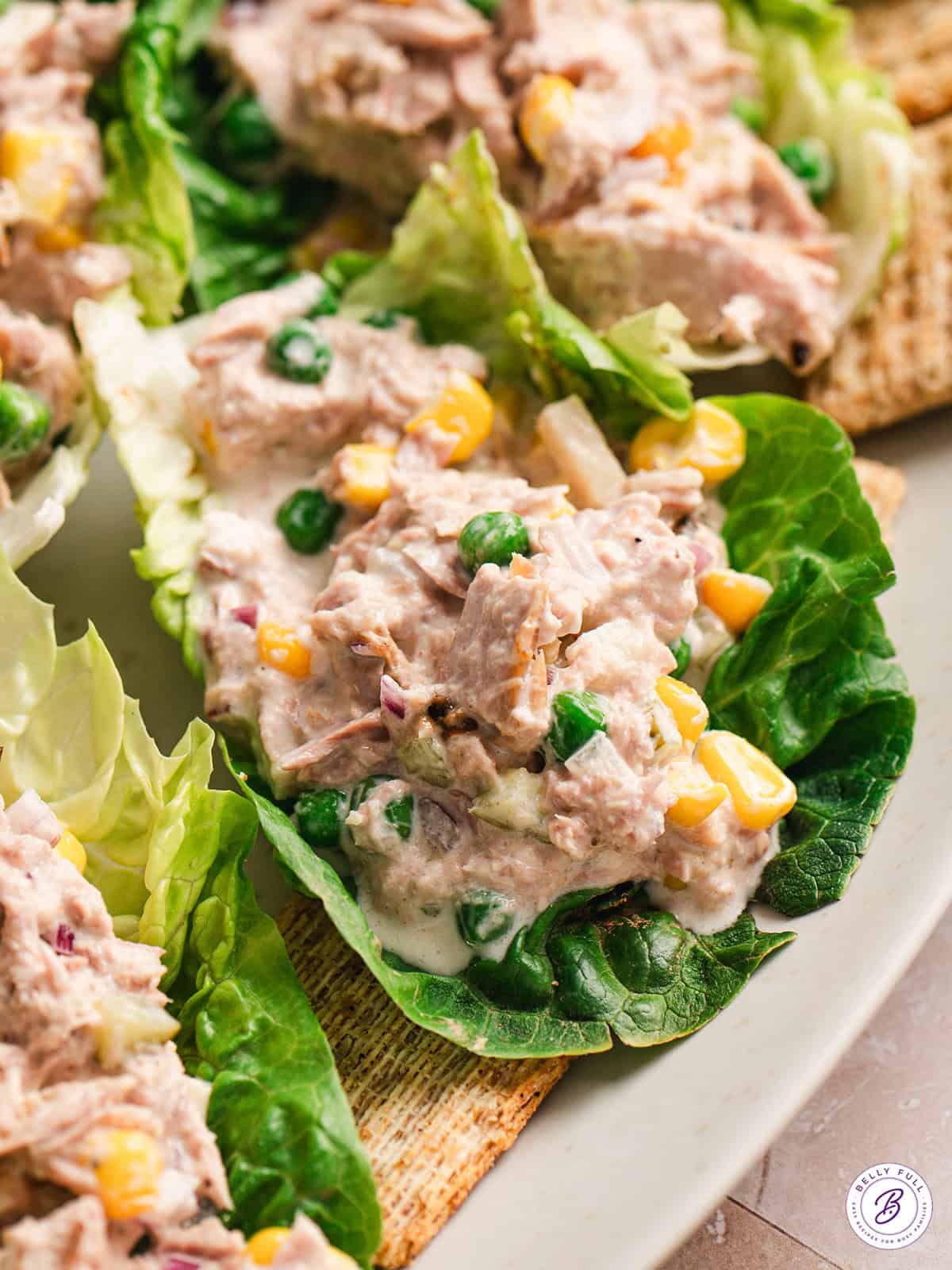 This tuna salad recipe is very versatile! It makes a great tuna sandwich on sturdy sliced bread or a croissant. For a low-carb option, serve it on lettuce leaves. My family also enjoys eating it with crackers, like a dip, as a snack or light lunch.