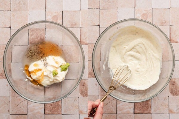 - In a medium bowl, whisk together 1/2 cup mayonnaise, 1 & 1/2 teaspoons wasabi paste, 1 tablespoon lemon juice, 1/2 tablespoon EACH white wine vinegar, Italian salad dressing, and honey (or agave), and a touch of salt and pepper.