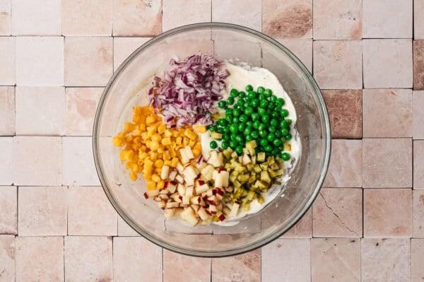 - Add in 1 to 2 tablespoons chopped Jalapeรฑo chili crisps, 2 tablespoons diced gherkins, 1/4 cup EACH diced red onion, diced apple, corn kernels, and frozen peas. Give it a stir to combine.