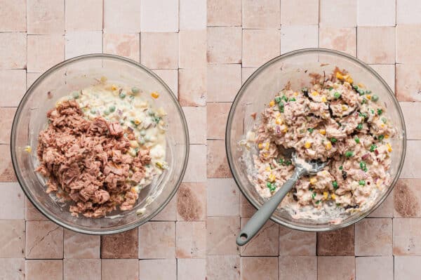 - Drain a 10 ounce can of tuna and break it up a bit. Fold it into the mixture until well combined. Add more mayonnaise, if desired.
