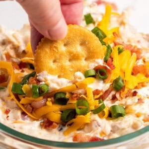 My guests enjoyed this dip!!I served it with wheat thins, and pita crackers. It had a wonderful crunch to it but just be careful about additional salt because of the bacon and the cheese! Itโs a keeper!!