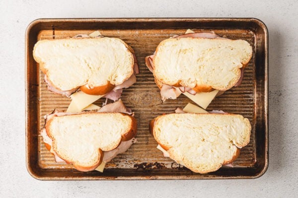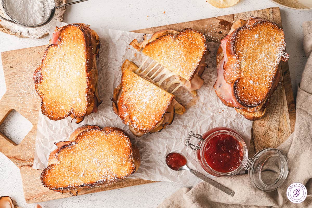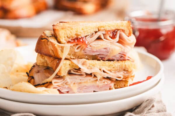 This baked Monte Cristo grilled cheese is my twist on the classic Monte Cristo sandwich. Thin slices of ham, turkey, cheese, strawberry jam, and Djion mustard are piled on thick slices of challah bread, then cooked in the oven instead of fried. It’s so quick and easy to make several sandwiches at a time!