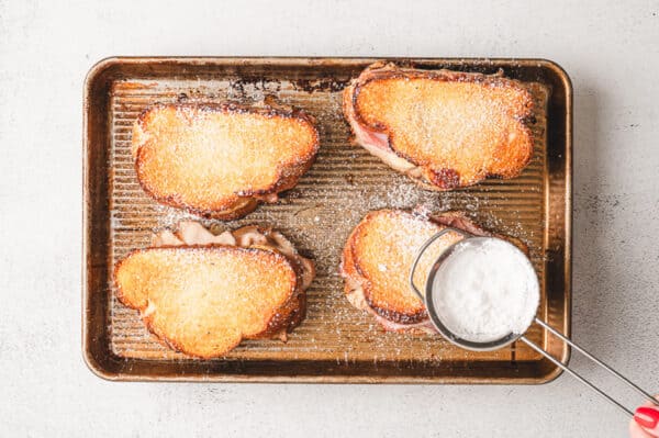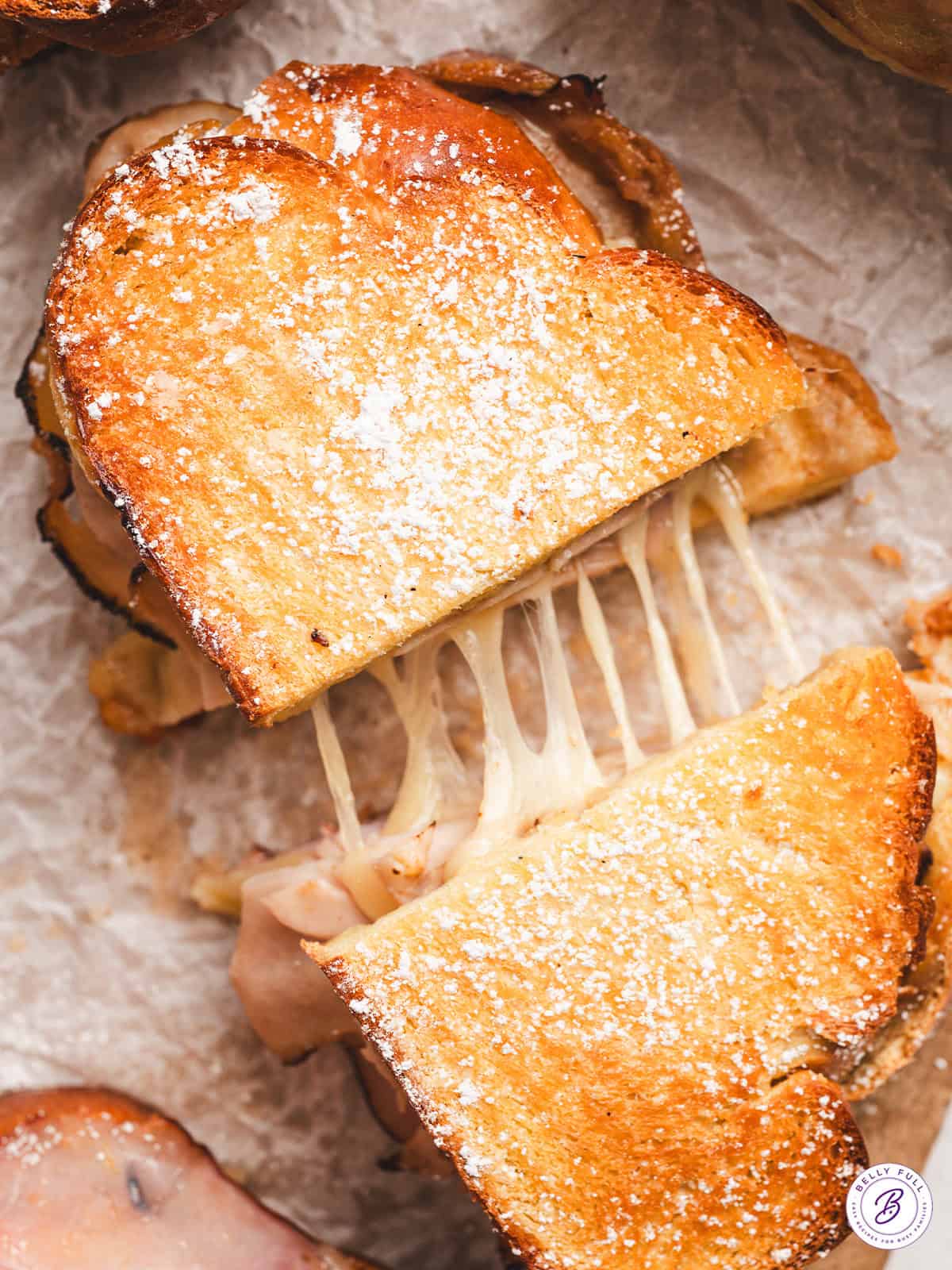 If you’ve never had a Monte Cristo sandwich, the combination of deli meats, cheese, jam, mustard, and powdered sugar might sound very strange but the sweet and salty combo is delish! Typically this sandwich is dipped in batter and deep fried, but this Monte Cristo grilled cheese recipe of mine skips the batter and is baked in the oven instead until perfectly golden like with my original oven grilled cheese recipe. It’s a bit lighter and the prep is way easier. Plus it’s a faster way to make multiple grilled cheese sandwiches so everyone eats at the same time!