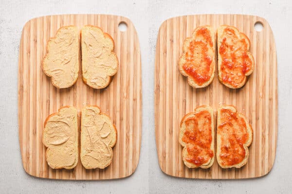 - On the unbuttered side of each slice of bread, spread 1/2 tablespoon EACH dijon mustard and strawberry jam.