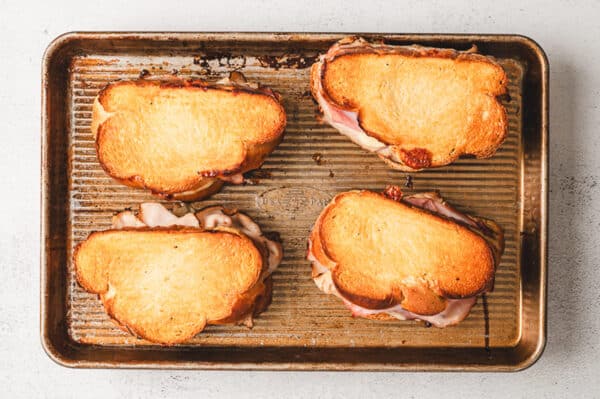 - Bake for 5 minutes, flip the sandwiches over and bake for another 5-7 minutes until the bread is golden brown and cheese is melty.
