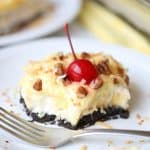 We love creating fun twists on the classic flavors of a banana split, like our banana split dessert kabobs, banana split mini cheesecakes, and this banana split lush. With a buttery chocolate crust, a creamy middle, layers of sliced banana and crushed pineapple, then topped with whipped cream, maraschino cherries, chocolate syrup, and nuts – it’s rich, yet light, and incredibly delicious! So easy, no oven needed, and great for making in advance, so it’s perfect for summer gatherings.