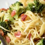 This dish checks all the boxes for me – it’s full of flavor from salty bacon, chicken broth, and Parmesan, you get your veggies built in with tender broccoli, the pasta makes it hearty, it’s read in under 30 minutes, and all made in one pot so clean up is a breeze. Make it for your family, and I promise it will be an instant favorite.