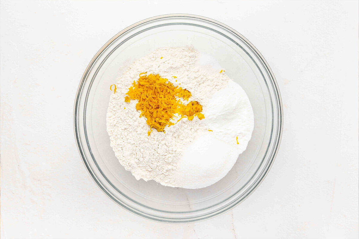- In a large mixing bowl, combine flour, baking powder, sugar, salt, and 1 tablespoon of orange zest.
