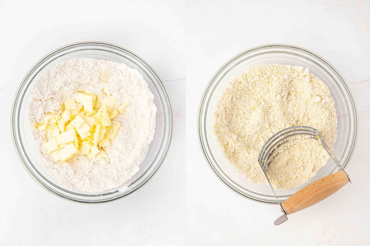 - Add chilled and cubed butter and cut in with a pastry blender until mixture resembles coarse crumbs.