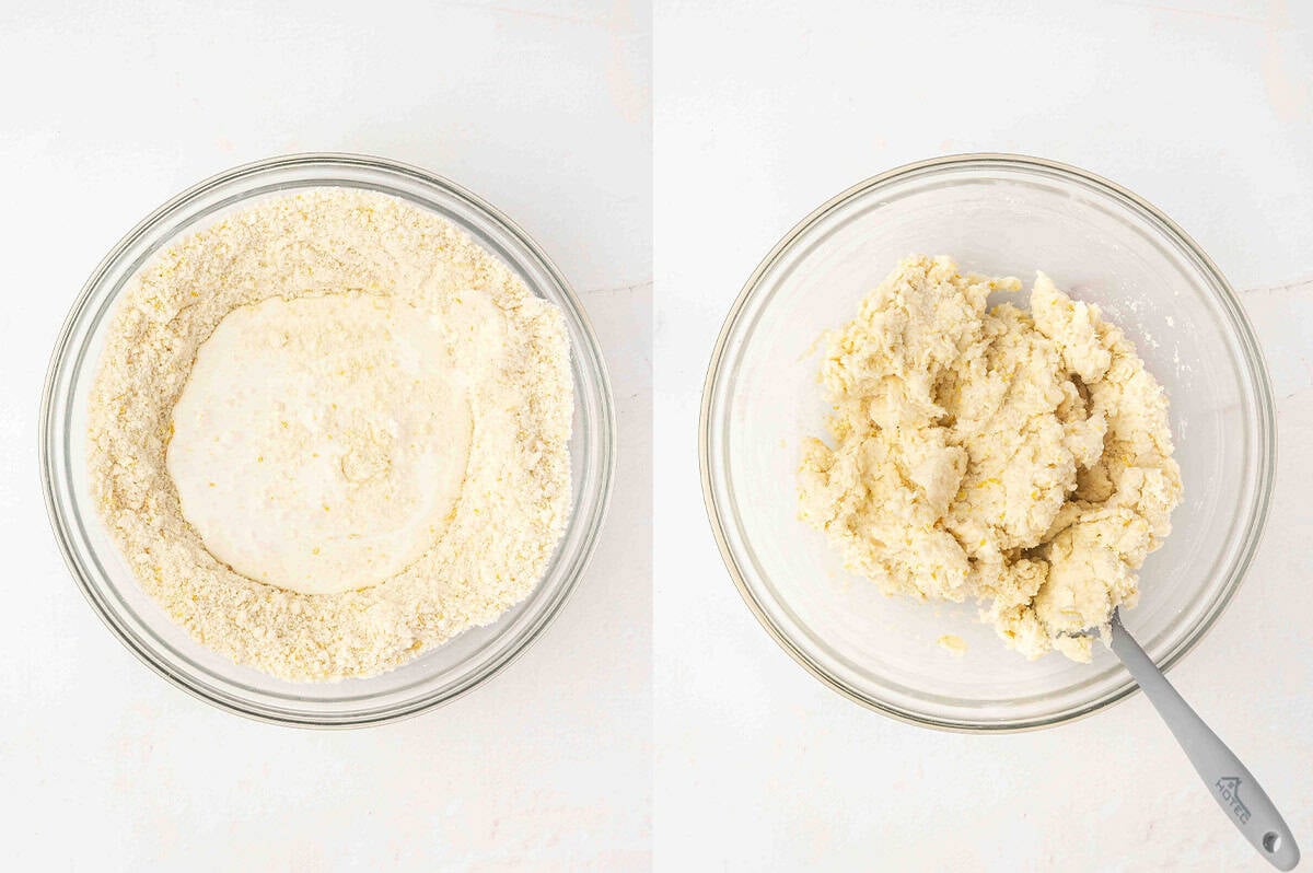 - Add heavy cream and fold together gently until the mixture just begins to come together and form a soft dough. It will be wet. (Do not knead or over mix the dough.)