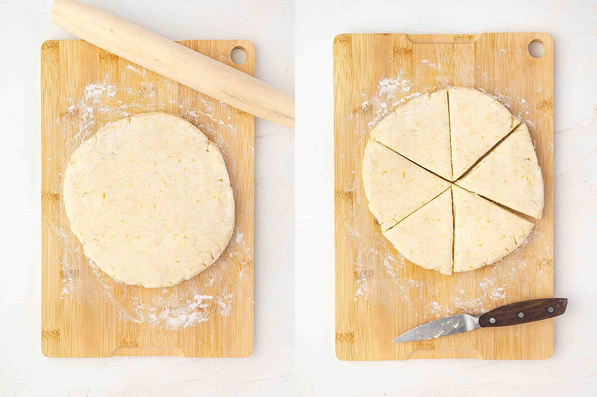 - Turn dough out onto a floured surface and pat into a 1-inch thick circle. (If dough is very sticky, sprinkle with just a hint of flour.) Using a sharp knife or bench scraper, cut into 6 equal triangles.