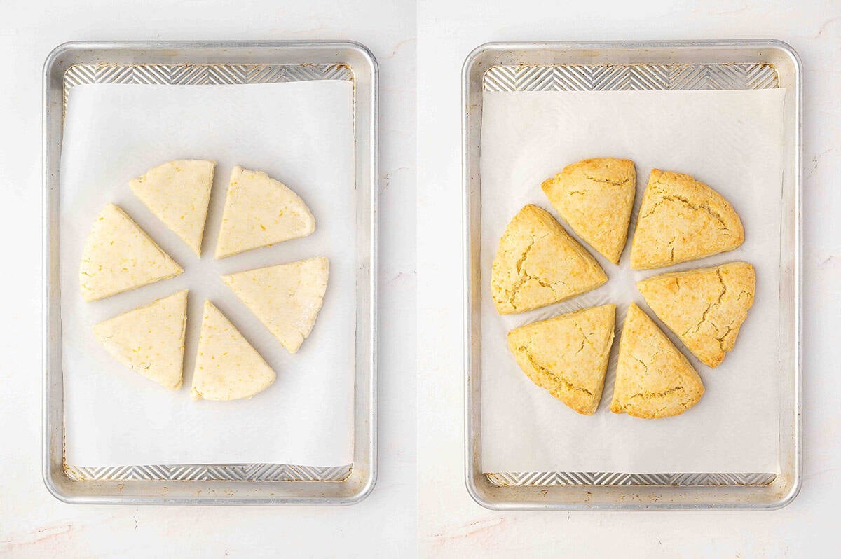 - Bake. Place scones on prepared baking sheet and bake 16-18 minutes or until no longer wet, golden, and cooked through.
