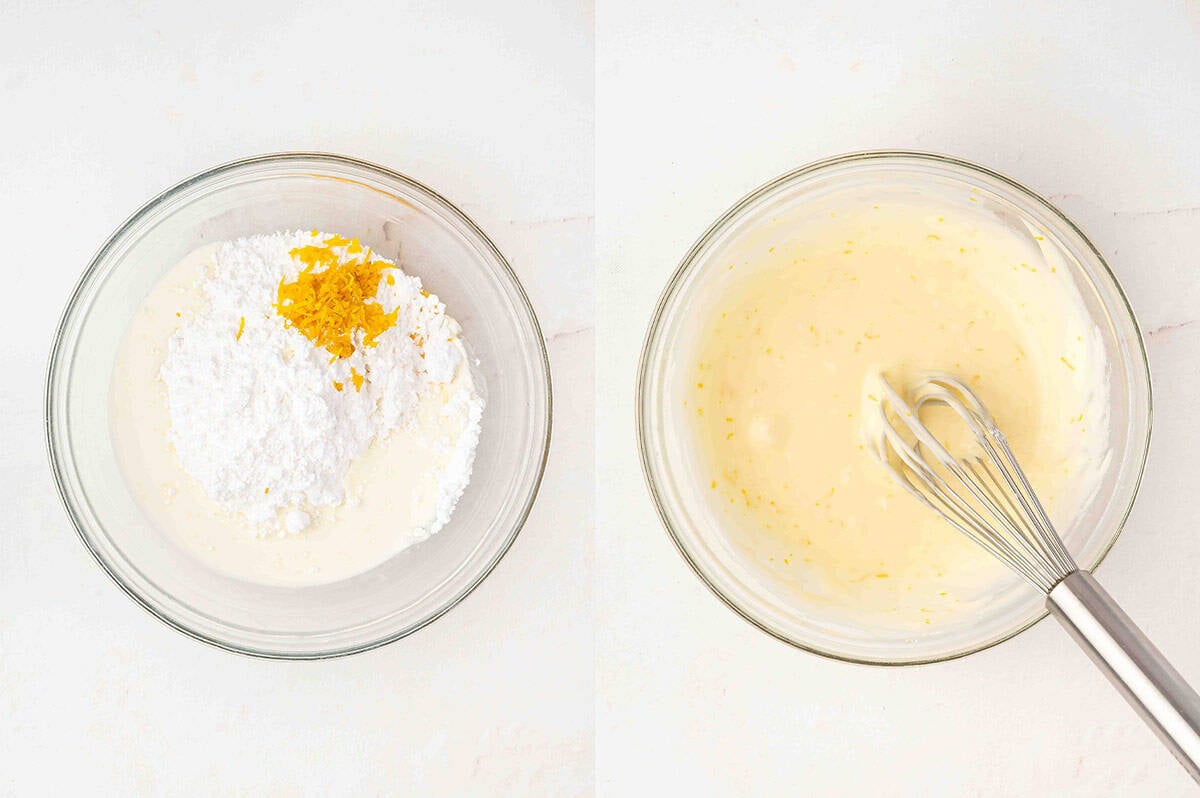 - Make the glaze. In the meantime, make glaze by whisking together 2 cups powdered sugar, 1/3 cup heavy cream, 1 tablespoon orange juice, and the remaining 1 tablespoon orange zest until smooth. (If the glaze is too thick, add a bit more cream. If it’s too thin, add more powdered sugar.)