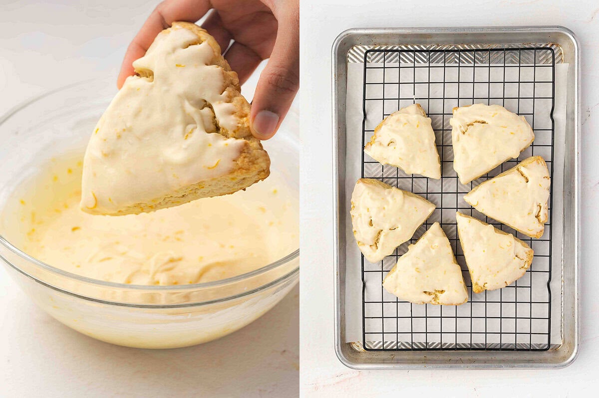 - Glaze the scones. Submerge the tops of the scones in the glaze.