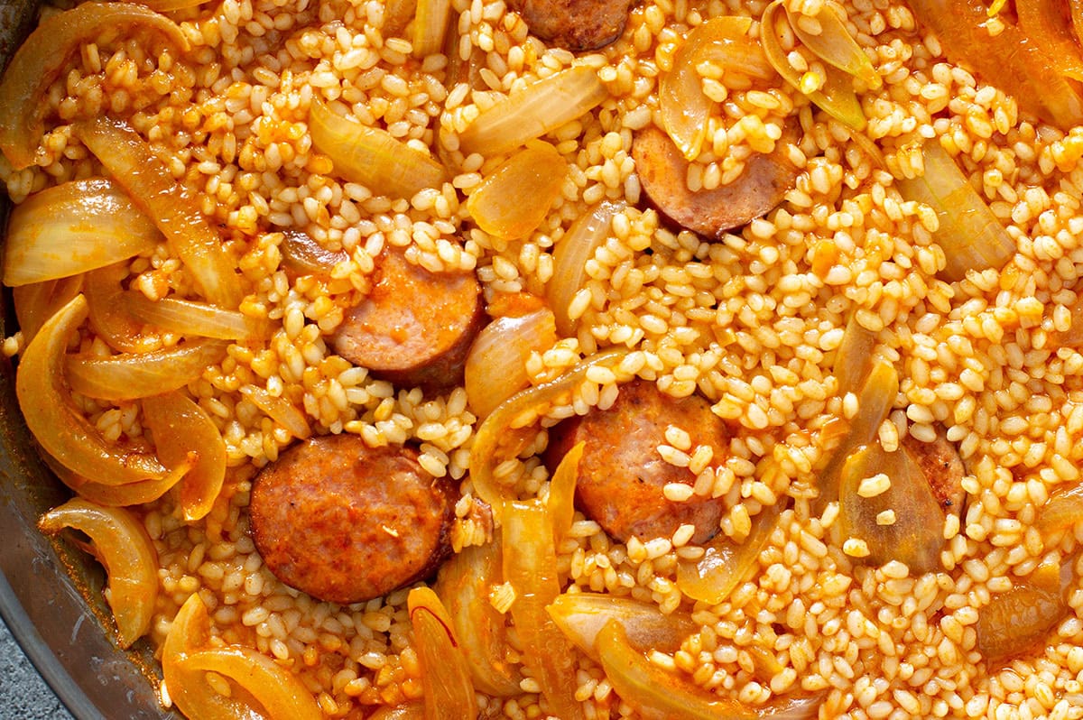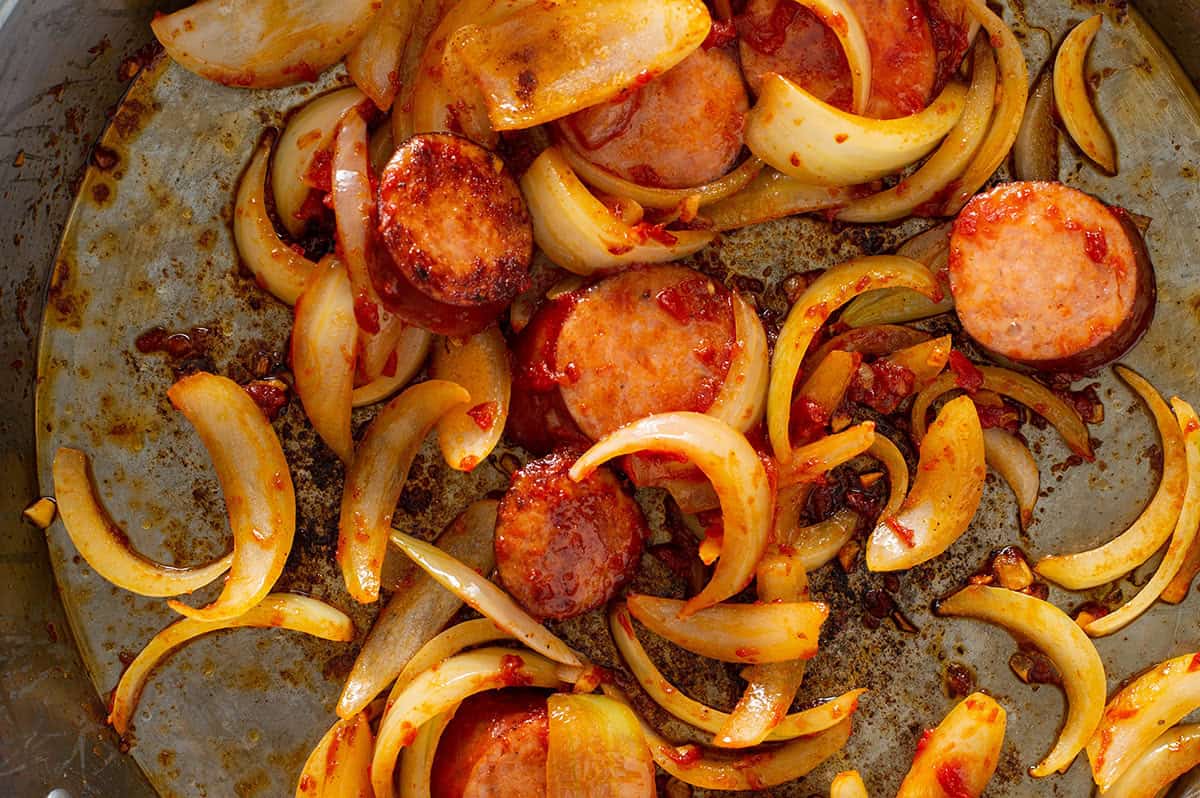 - Sautรฉ chorizo and onion. Warm 2ย tablespoons olive oil in a 12 to 14-inch paella pan (or large stainless-steel skillet) over medium-high heat. When oil is hot, add in 5ย ounces cooked dried and smoked sliced Spanish chorizo and 1 medium sliced onion; sautรฉ for about 3 minutes. Add in 3 minced garlic cloves and cook until fragrant, about 20 seconds.
