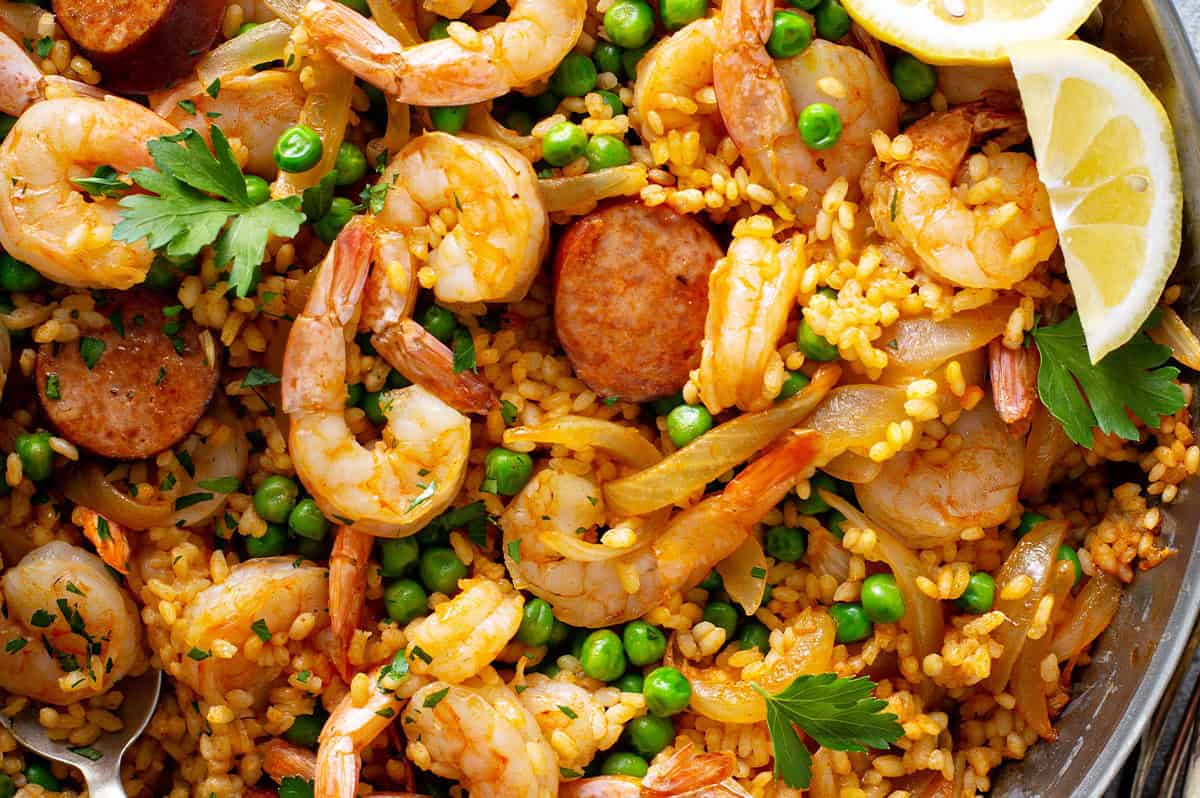 Including rice, shrimp, chorizo, and peas, Paella is really a complete meal in itself, but it does pair well with caesar salad or crusty bread to soak up the sauce. For dessert, you can’t go wrong with flan or tres leches cake.