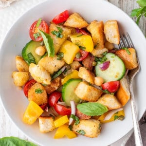 Serve panzanella salad as a side to round out your Italian dinner. It goes great with Grilled Chicken, Lasagna Roll Ups, Chicken Alfredo, and Italian Meatballs.