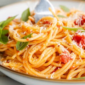 This classic pasta al pomodoro is a favorite Italian recipe you should always have in your back pocket for a quick and easy meal that’s virtually impossible to mess up. It makes such beautiful use of just a few simple ingredients – each and every one is an equal co-star in this pasta dish. Juicy tomatoes, savory, nutty garlic, spicy red pepper flakes, and fragrant basil come together in a gorgeous, light sauce that sinks into the pasta itself, infusing flavor into every bite. The whole dish comes together in just over 30 minutes and is adult and kid approved.