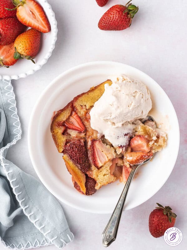 Peach dump cake is best served warm or at room temperature, but you want to let it sit for at least 15 minutes out of the oven before serving. Otherwise, it’s super hot!
