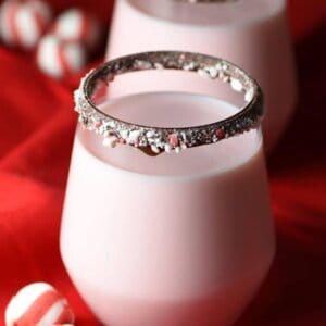 - Dip the rims of tumbler glasses in melted chocolate and crushed peppermint candies; chill for about 10 minutes to set.