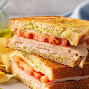 A classic grilled cheese sandwich taken up a few levels with provolone cheese, turkey, tomato, and the most amazing pesto-mayo spread. This recipe is total comfort food at its best and great for a quick and easy lunch or dinner!