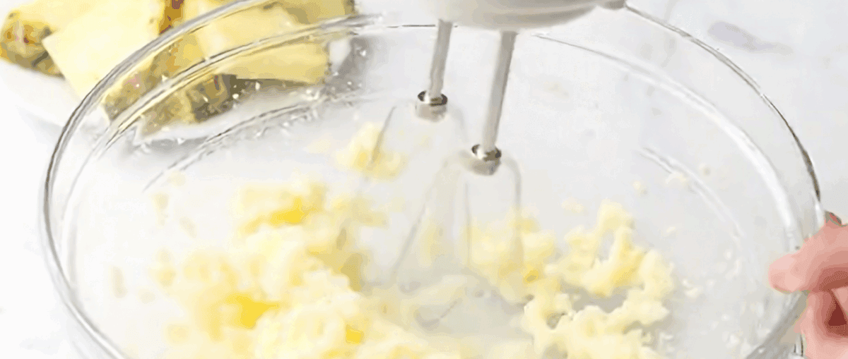 - In a large bowl using a handheld electric mixer, beat the butter and sugar together until light and fluffy. Add in the eggs, half and half, pineapple juice, and vanilla. Beat in the flour, baking powder, and salt, until combined.