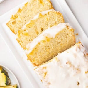 This pineapple bread is a quick and easy loaf cake that’s perfectly dense and moist. It’s sweet but not too sweet since tart pineapple is one of the primary ingredients. This is one of those breads that I like to eat for breakfast or dessert.