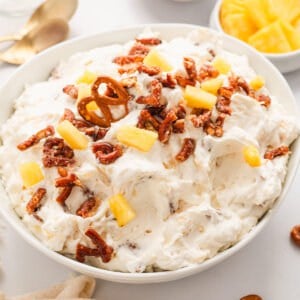 - Transfer to a serving bowl and top with the reserved pretzel pieces (or serve portions in dessert cups and top with piped whipped cream, crushed pretzels, and a couple of pineapple pieces.)