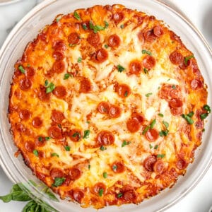 This cheesy pepperoni dip should be served warm from the oven. My favorite way to serve it is with crostini or garlic bread. However, you can also dip breadsticks and even wonton crackers. Pretty much any savory dipper will work but I definitely recommend some type of bread for all that delicious pizza flavor.
