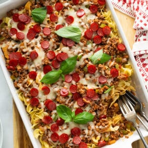This pizza noodle casserole is easy to prepare, using pantry ingredients, and tasty, making it a great weeknight meal. If your family loves pasta and pizza, they’ll love this dish!