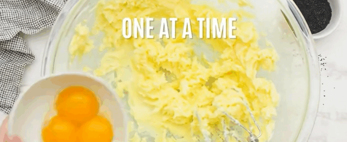 Cream the butter: In a separate bowl, cream 1 cup butter and 1 cup sugar until light and fluffy. Add the 4 yolks one at a time, followed by the 1 tsp vanilla. Stir in 1/3 cup poppy seeds.