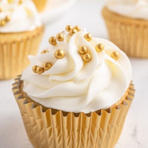- Once the cupcakes are cool, pipe on the buttercream and decorate with gold pearl sprinkles.