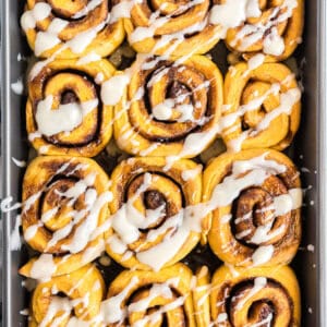 I’ve made soft yeasted rolls flavored with pumpkin puree and filled them with a sweet, spiced brown sugar filling, then topped them with a vanilla cream cheese frosting for the ultimate fall indulgence. These pumpkin cinnamon rolls are perfect for breakfast, brunch, the fall season, or even a special holiday treat!