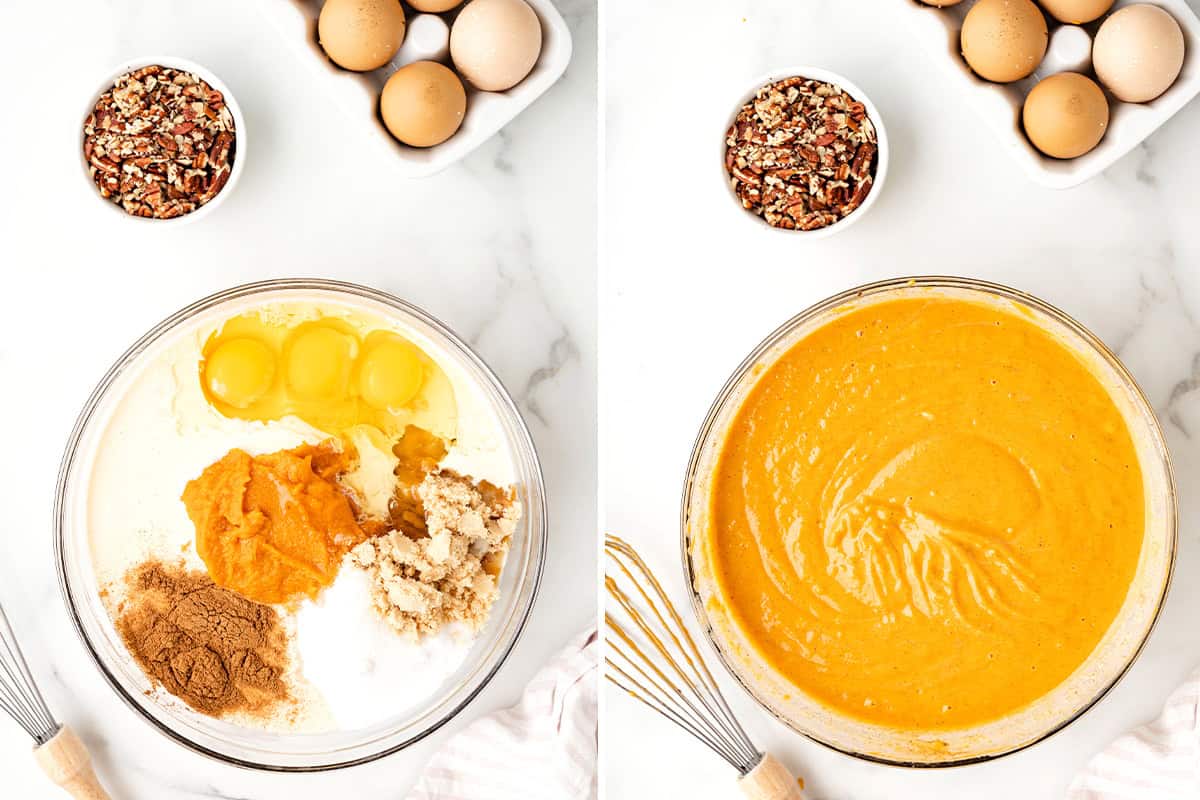 - Prepare the pumpkin mixture: Combine the 29 oz. canned pumpkin purée, 12 oz. can evaporated milk, ½ cup granulated sugar, ½ cup brown sugar, 3 large eggs, 2 tsp pumpkin pie spice, and ½ tsp salt.