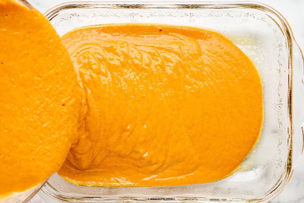 - In a large mixing bowl, whisk together the pumpkin purée, evaporated milk, granulated sugar, brown sugar, eggs, pumpkin spice, and salt until thoroughly combined and smooth. Pour the pumpkin mixture into your prepared pan.