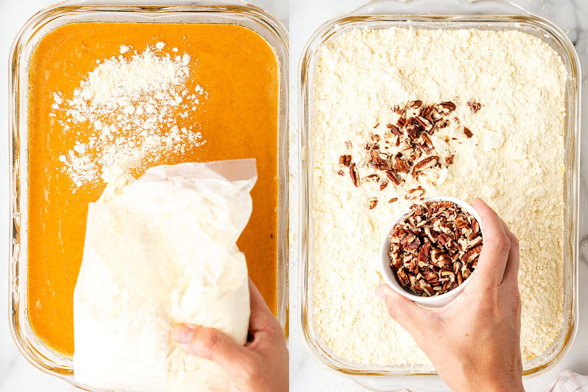 - Sprinkle the cake mix evenly over the top of the pumpkin mixture, followed by the pecans.