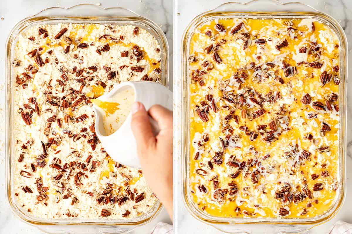 - Drizzle the melted butter evenly over the entire surface, ensuring it covers as much of the cake mix as possible to ensure a crispy, golden topping.