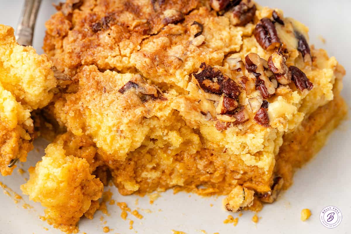 While I recommend diving into this pumpkin dump cake while it’s still a bit warm, it needs to cool for at least 30 minutes once it comes out of the oven. Otherwise, the filling won’t set and it will just fall all over your plate.
