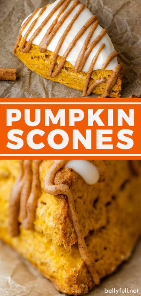 Soft and tender pastries topped with both white and pumpkin glaze, these easy Pumpkin Scones are a version of the popular Starbucks scones. This easy scones recipe requires no chill time for the dough. Easy to make and filled with pumpkin pie flavor in every bite!
