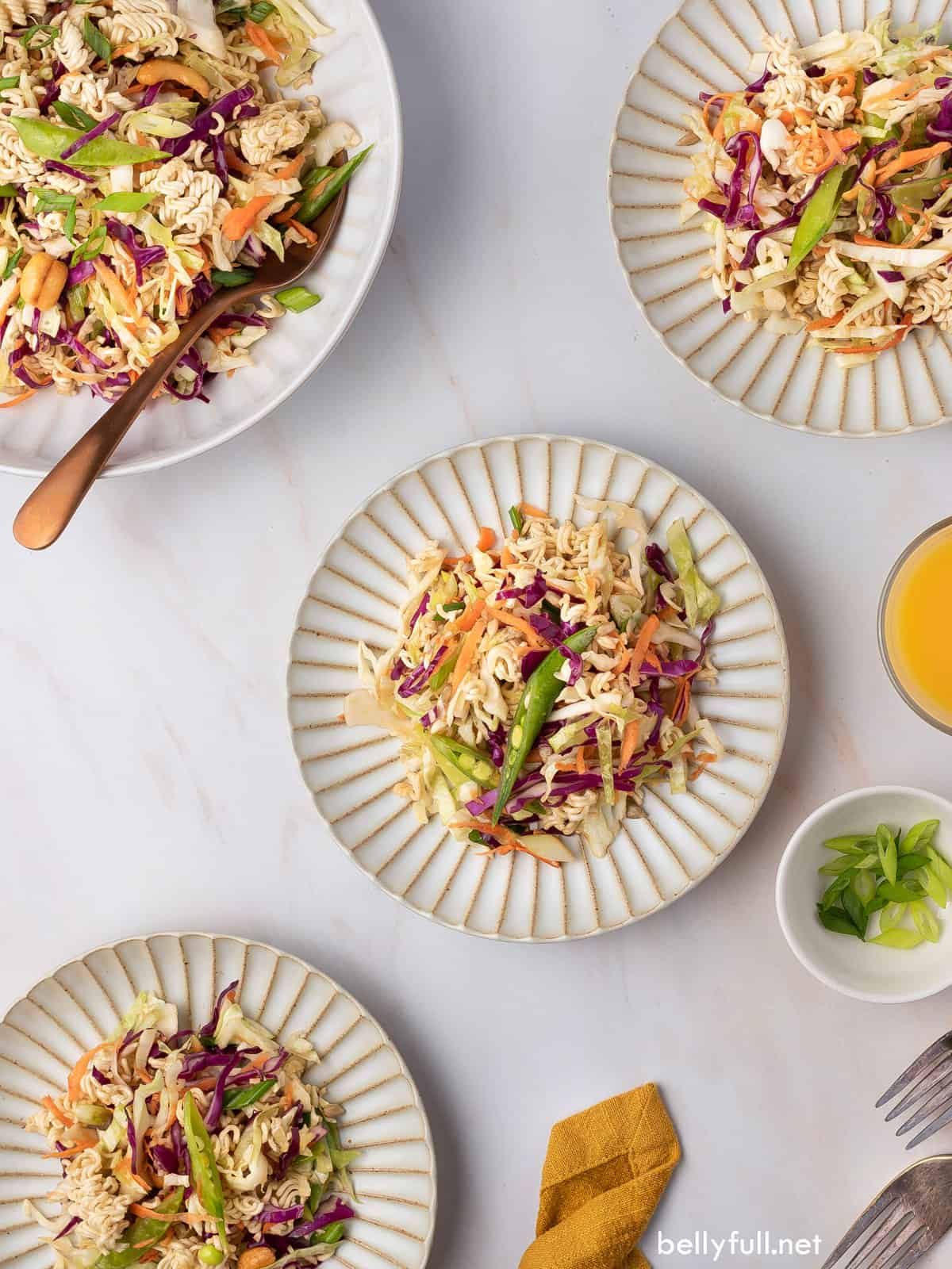 You can make the salad up to 6 hours in advance, but we really enjoy it best right after it’s assembled. Once the dressing is added, the noodles will begin to soften—not limp like cooked pasta, but softer. I prefer the vegetables to have texture and those noodles to be crunchy!