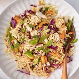 Classic Ramen Noodle Salad is a fresh cabbage salad with a delicious Asian twist, including a mix of coleslaw, vegetables, nuts, a sweet, tangy dressing, and crunchy ramen noodles. I like to serve it as a dinner side salad or bring it to potlucks where everyone begs for the recipe—it’s just fantastic!