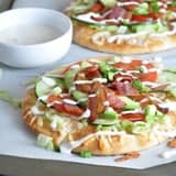 - Distribute the lettuce, cucumber, tomato, avocado, scallions, and bacon pieces onto each flatbread and drizzle with 2 tablespoons of the Ranch dressing.