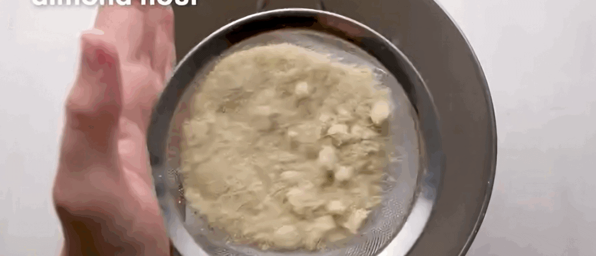Sift: Use a fine mesh sieve to sift 95 grams powdered sugar and 95 grams almond flour into the egg whites.