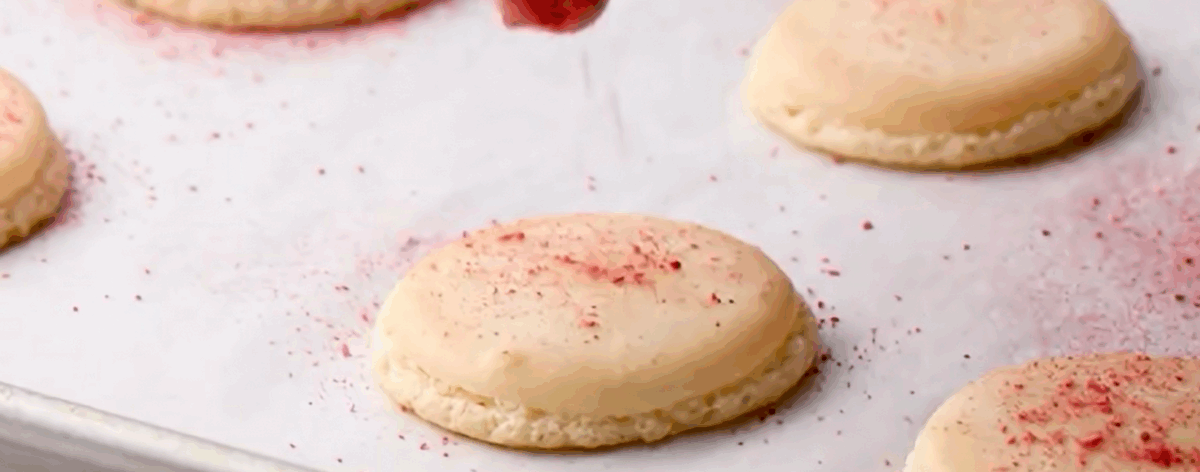 - Remove the macarons from the oven and immediately sprinkle them with the freeze dried raspberry powder.