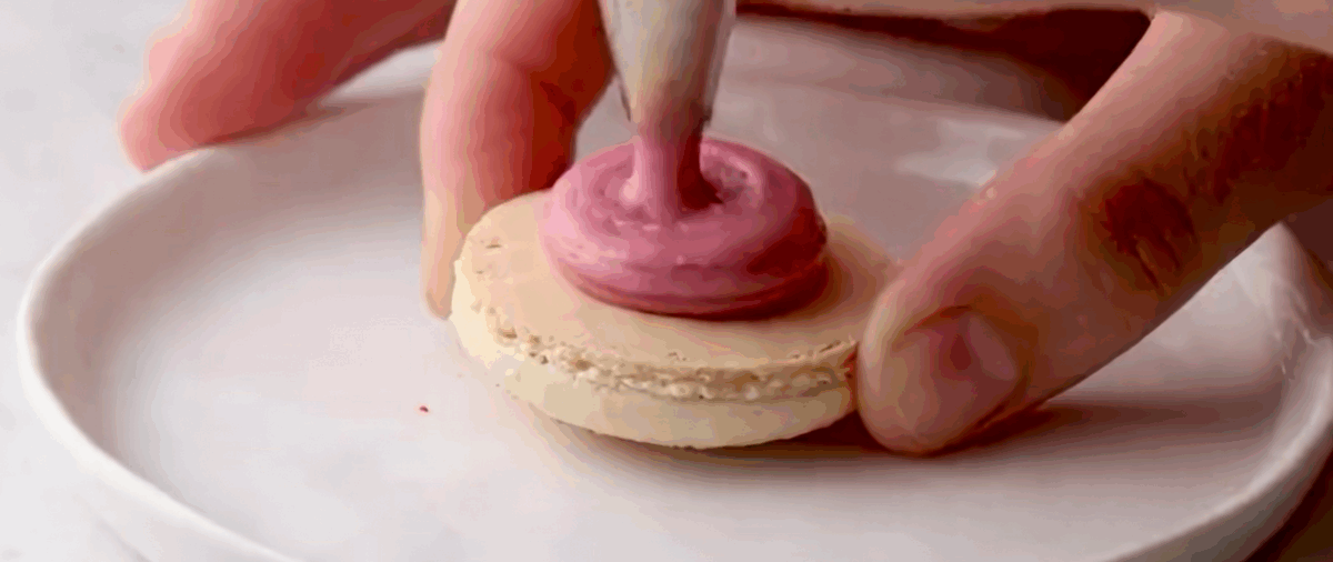 Assemble: Place the macarons in similar sized pairs and add a small dollop of filling to one of the macarons. Place the second macaron on top and press them together gently, just until the filling reaches the edges. Repeat with the remaining macarons.