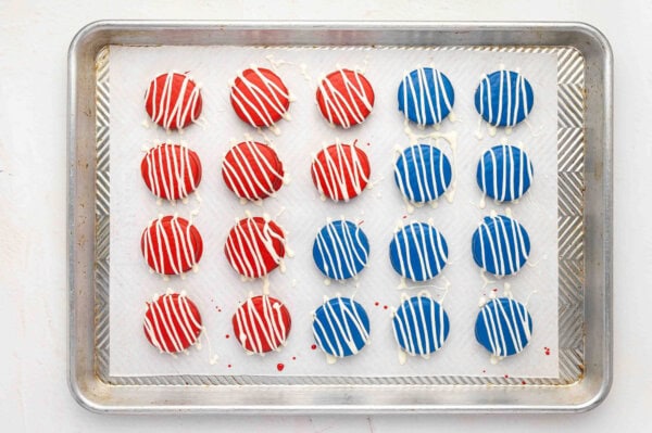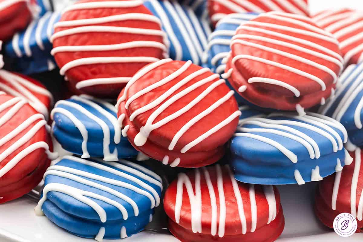 Store red white blue Oreos in the fridge in an airtight container. Parchment paper can be placed between layers. Enjoy within 1-2 days.