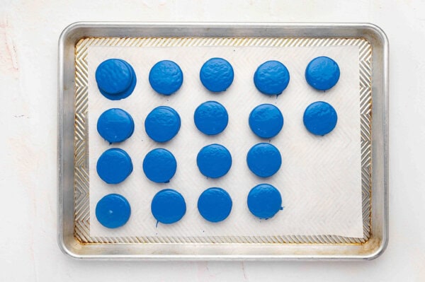 - Place the blue dipped Oreos on the baking tray. Do this for 18 Oreos. Place in the refrigerator to set.