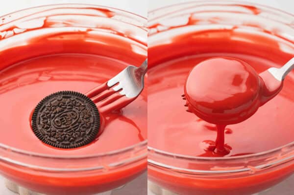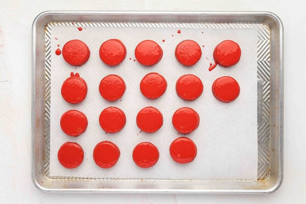 - Place on the red dipped Oreos on the baking tray. Do this for the remaining 18 Oreos. Place in the refrigerator to set.