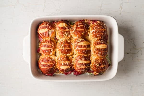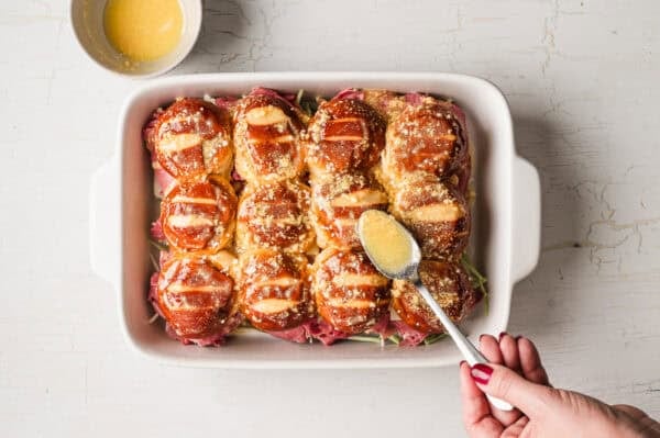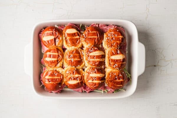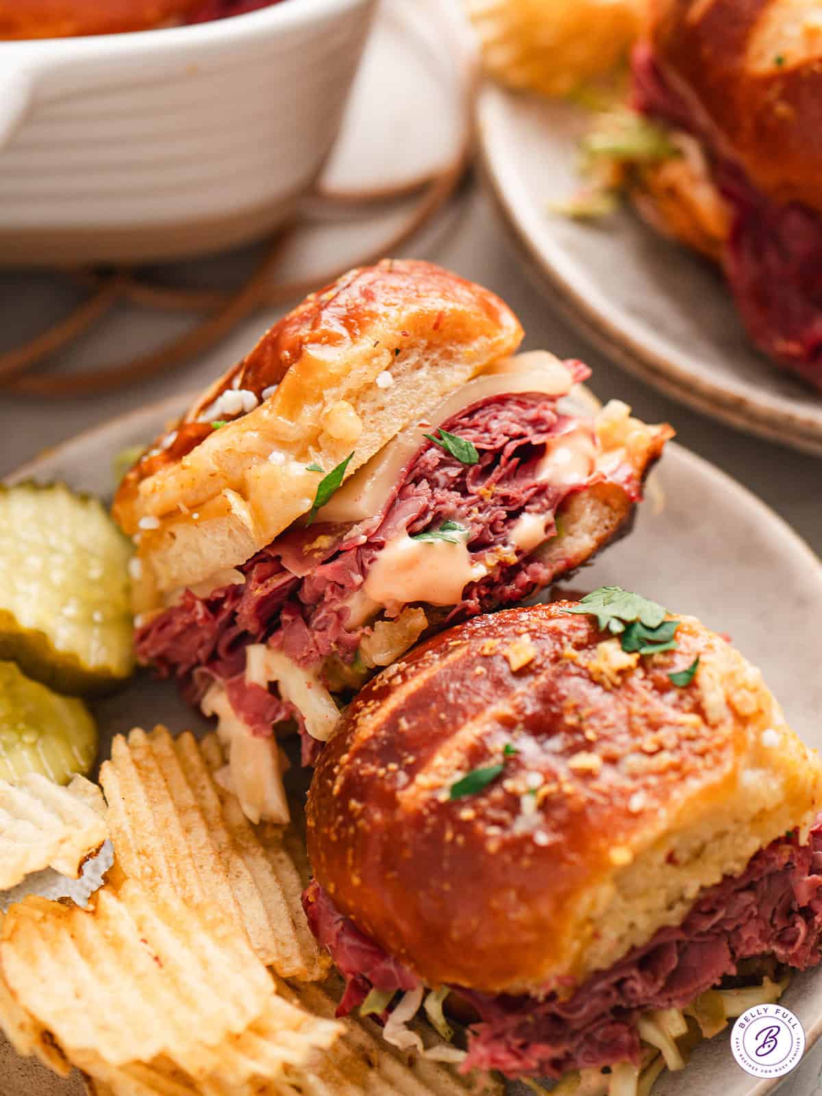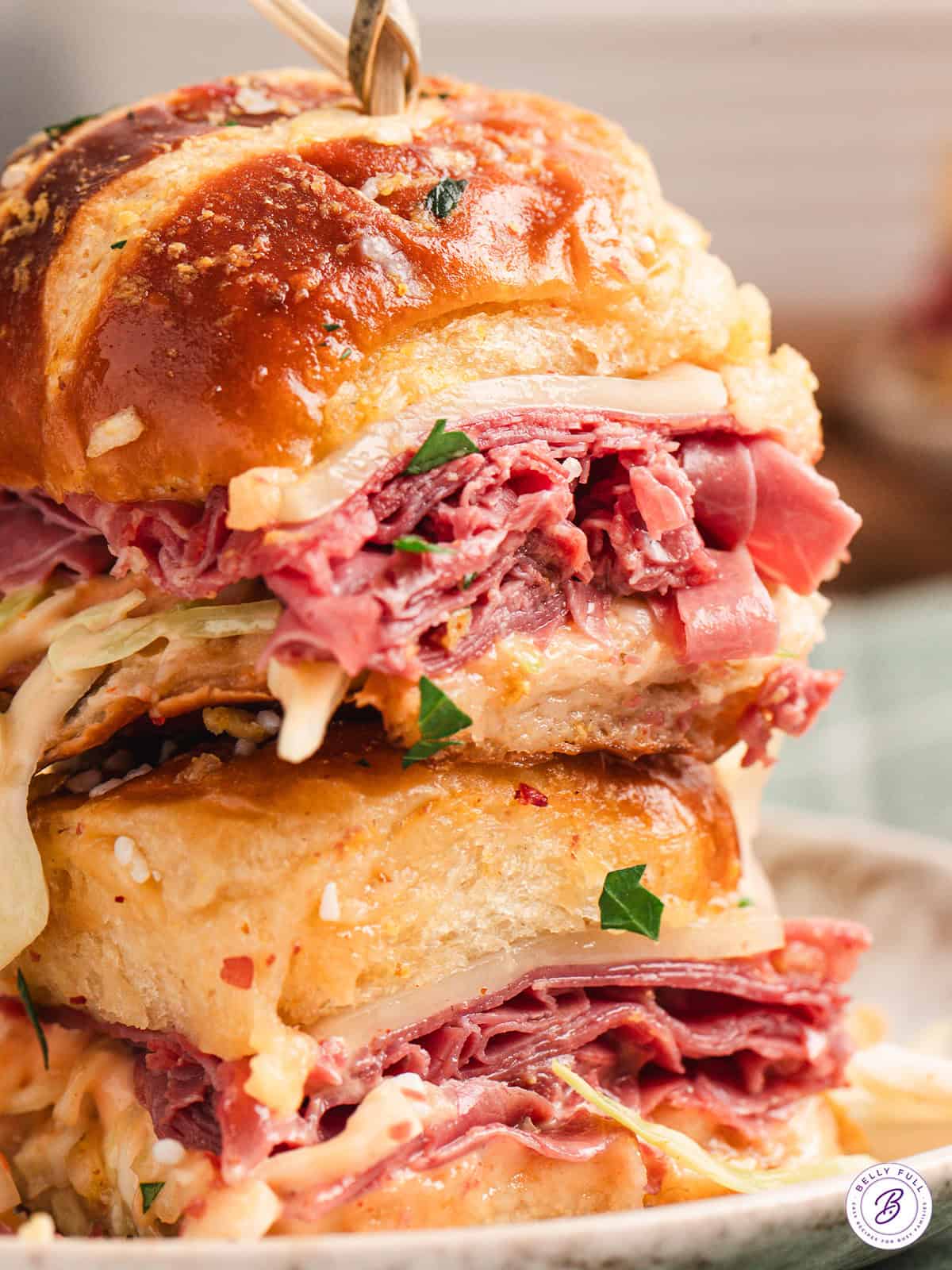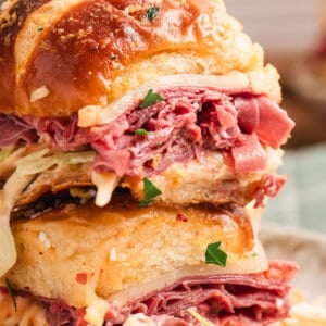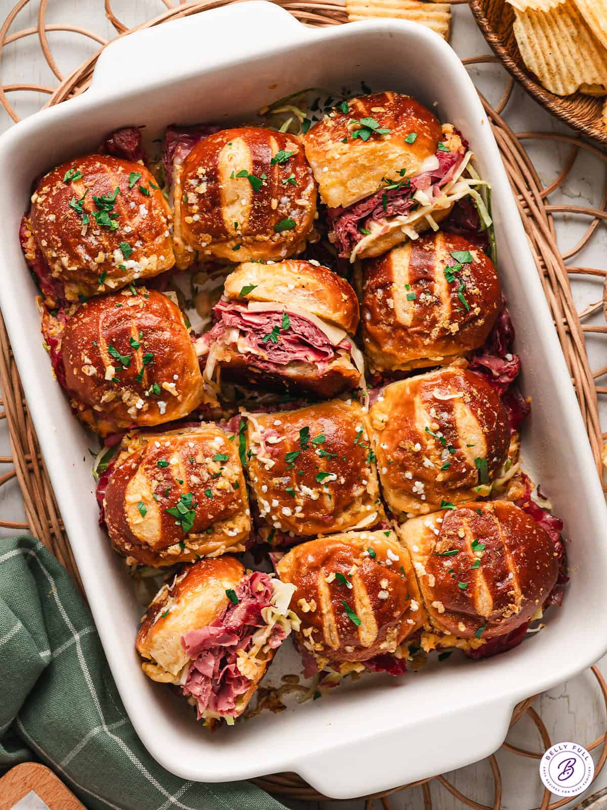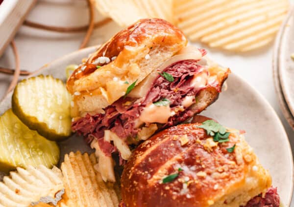 These Reuben Pretzel Sliders combine all the classic Reuben goodies onto small pretzel rolls, with a killer sauce that coats the buns as they bake. Great crowd pleaser for game day or an easy weeknight dinner!